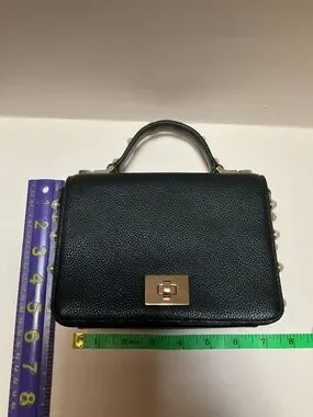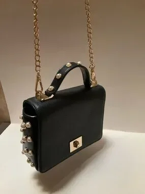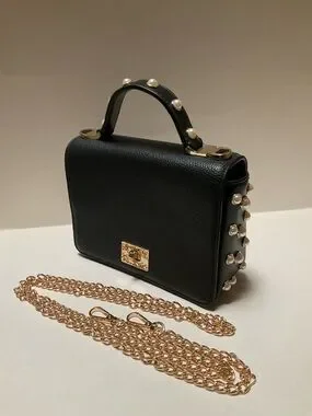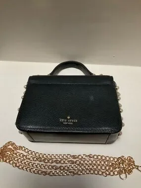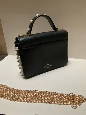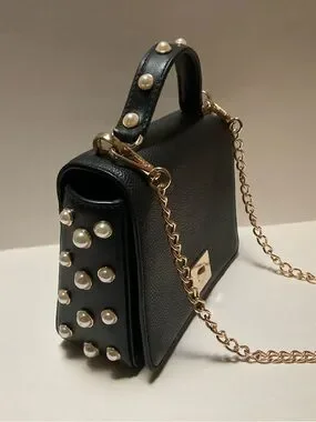 Kate Spade Mini Crossbody Black Leather pochette Purse with Pearl studded embellishments on Sides and Top Handle