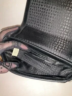 Made with pebbled leather . Magnetic snap on flap closure. Approx 5.2” h x 7” w x 2.2” d. Drop length 2” handheld. Interior- 3 credit card pockets, exterior- back slide pocket. Gold foil embossed Kate Spade New York signature.