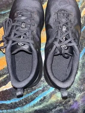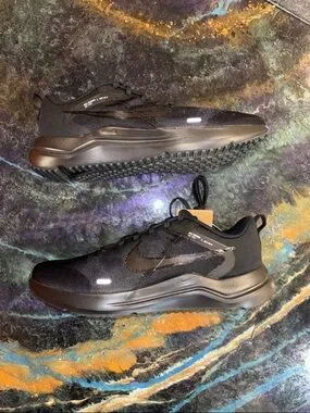 All-black Nike men’s sneakers with a sleek textile upper. Padded collar and cushioned midsole for steady comfort. Rubber outsole provides dependable grip. Easy lace closure for a secure fit.