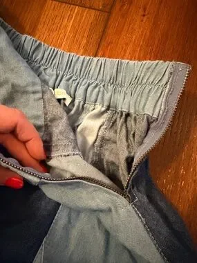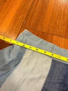 A-line midi skirt in alternating light and dark blue panels. Lightweight denim-look fabric with a flattering flared silhouette. Comfortable fitted waistband for easy wear. Pairs well with tees or blouses for casual to smart-casual looks.