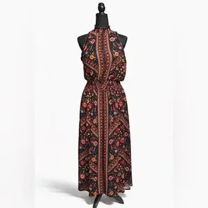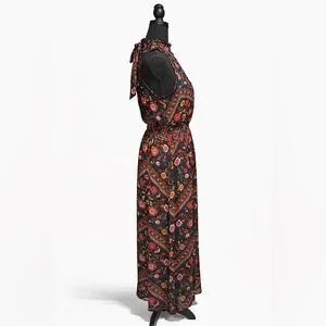 Gorgeous sleeveless boho long dress with a mock neck and elastic waist. Soft fabric and bold floral print make it perfect for summer or festivals.
