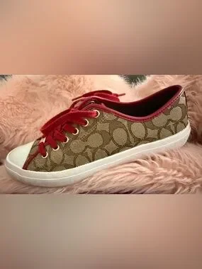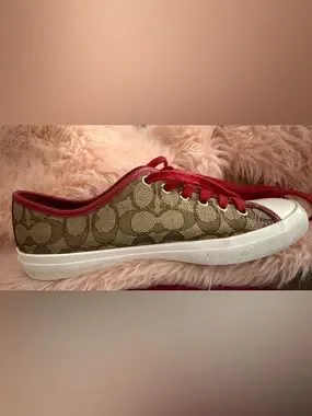 Classic Coach monogram canvas sneakers. Brown monogram with red laces and trim. Gold-tone eyelets add shine. Low-top casual style.
