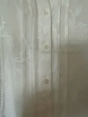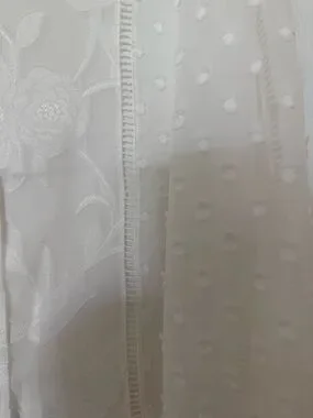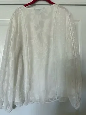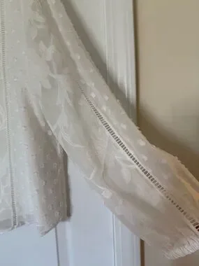 Lined sheer white blouse with floral embroidery and textured Swiss-dot sleeves. Buttons down the front with subtle pintuck details. Lightweight, airy silhouette with gentle V-neck. Feminine and versatile for day or evening. Worn once.