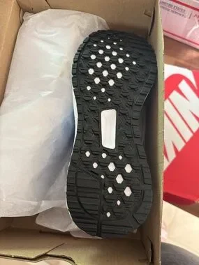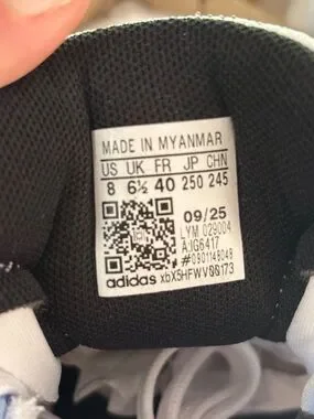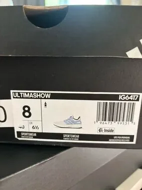 Lightweight adidas running shoes. White mesh upper with light blue stripe accents. Padded heel and cushioned outsole. Low-profile sporty design.