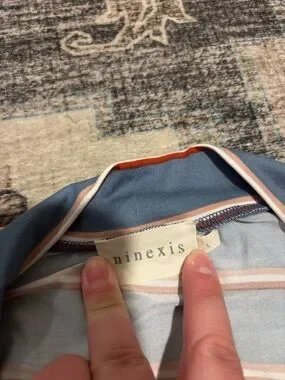Lightweight draped cardigan. Blue base with horizontal white and red stripe details. Open front, relaxed fit. Super soft and stretchy (polyester and spandex). Size L