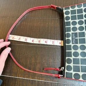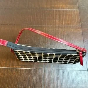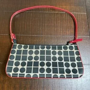 Super cute Y2K mini shoulder / baguette bag with bold black and white geometric print and red trim strap. Classic early 2000s style—perfect for everyday wear or adding a retro vibe to any outfit.