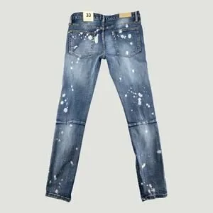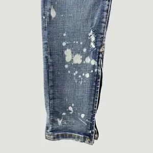 Details: Distressed rips, paint splatter design, ankle zip hems, stretch denim