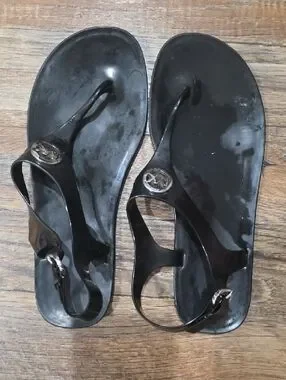 Glossy black jelly thong sandals. Silver-tone MK logo medallions on straps. Adjustable ankle slingback. Lightweight, casual summer style for any outfit. (No splotches on foot bed-bad lighting.)