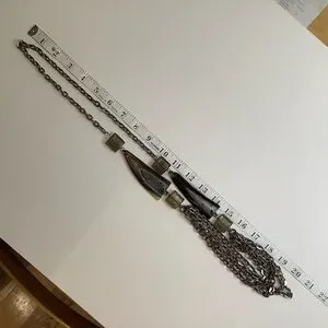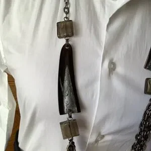 This versatile and lightweight multi-chain necklace adds an edgy element to any ensemble. 4 frosted glass cubes flank large tribal elements, with multiple chains anchoring this statement piece. Pewter tone hardware.