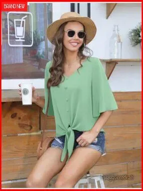 Casual V-Neck Batwing Sleeve Chiffon Blouse Tie Front Button Down
