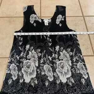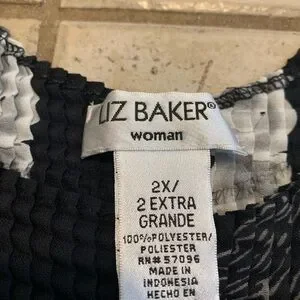 This is a stylish and comfortable sleeveless top from Liz Baker Woman. The top features a black and white floral print with a textured, crinkle-style fabric. The design is flowy and flattering, perfect for a comfortable yet chic look. It's a size 2X (2 Extra Grande) and made of 100% polyester. This top is versatile and can be worn on its own or layered under a cardigan or jacket. The black and white color scheme makes it a timeless addition to any wardrobe.