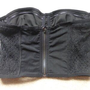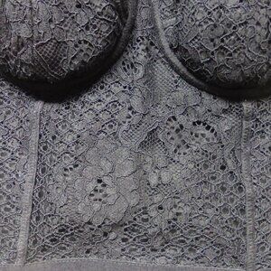 In very good condition! Floral eyelet pattern, padded cups, lined with silicone underneath, cropped, zips up in the back, the back has semi-sheer mesh details.