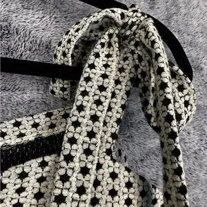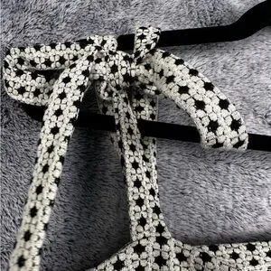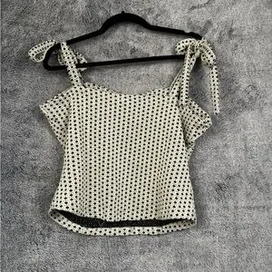 Feminine bustier camisole with adjustable tie shoulders. Cream base with small black floral print. Structured bust and fitted waist. Lightweight and flattering for day or night.