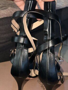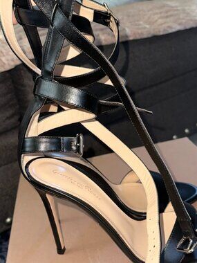 The Gianvito Rossi Women's Size 38 (US Size 7) Aleris 105 Leather Sandals in Black are a stylish and ultra-high heel option for various occasions. The strappy design, almond toe shape, and buckle closure give them a chic and sophisticated look. Made with leather upper and insole materials, these sandals are perfect for parties, cocktails, festivals, or even going out in a trendy and edgy style. The stiletto heel adds a touch of glamour, making them a must-have for any fashion-forward woman.