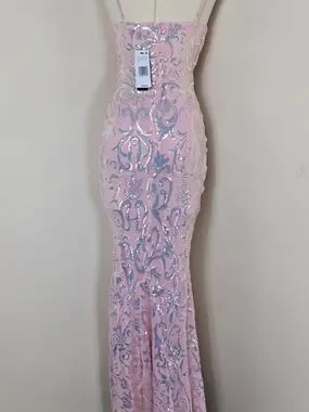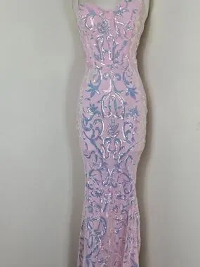 Strapless evening gown by Windsor. Soft pink base with iridescent blue sequin scrollwork. Fitted silhouette with elegant floor-length cut. Sparkling detail for formal events.