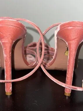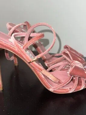 Aquazzura 105mm bow-embellished stiletto sandals. They are crafted from rose pink velvet and feature a bow on the toe and an ankle strap closure.