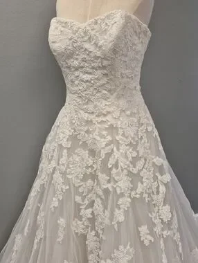 Details: Intricate floral lace appliqués on the bodice that cascade down a multi-layered soft tulle skirt.