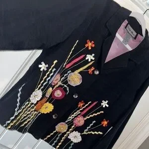 Black Linen like jacket blazer with 3D flowers or different materials and embroidery. Embellished