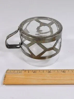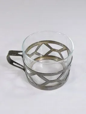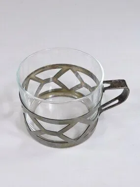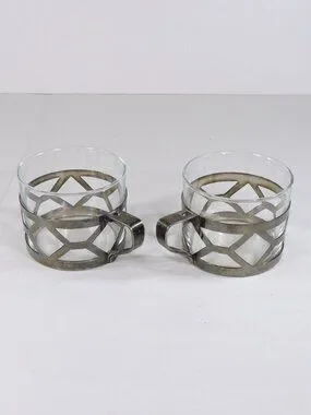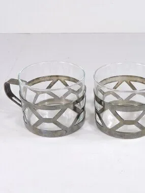 2 Duralex Tempered Glass Cups In Silver Tone Metal Holders - France - Coffee Tea