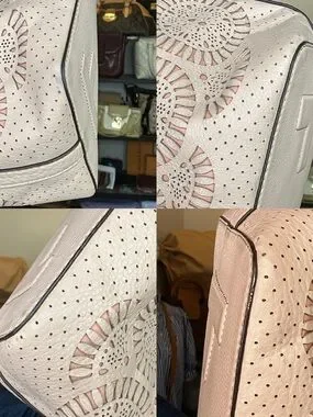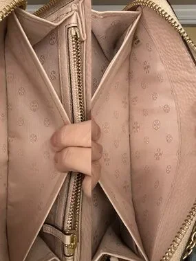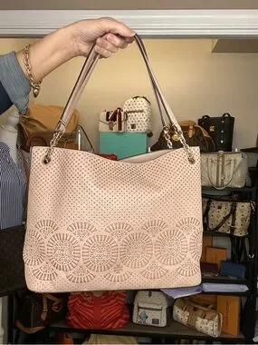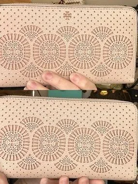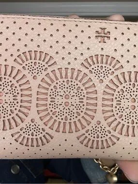 Beautiful matching Tory Burch perforated leather set featuring a shoulder tote and coordinating zip wallet in a soft blush pink tone. Feminine, lightweight, and perfect for everyday wear, spring/summer styling, or a polished neutral look.