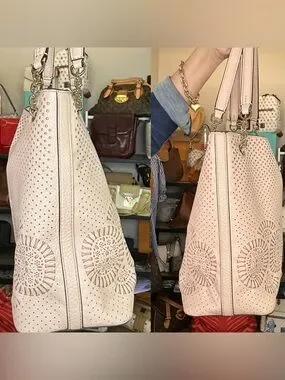 Crafted from pebbled leather with intricate laser-cut perforation and signature Tory Burch medallion detailing. Gold-tone chain and leather shoulder straps elevate the look while remaining practical for daily use.