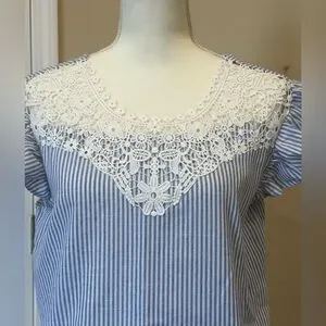 shein lace blouse womens large, blue white striped blouse women, cottagecore top women lace, boho flutter sleeve blouse, feminine summer blouse women, crochet lace yoke top, striped peasant blouse women, casual spring summer top women, lightweight airy blouse women, vacation outfit top women, brunch outfit blouse women, soft girl aesthetic top, coquette cottagecore blouse, romantic feminine blouse lace, everyday cute summer top women, flowy blouse striped women, relaxed fit blouse women, minimalist feminine top summer