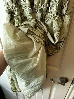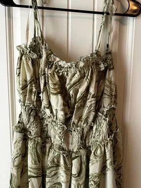ARULA Olive Green and Cream Marble-Print Smocked Spring Party Flowy Midi Dress