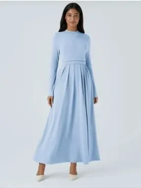 Elegant light blue maxi dress with a fitted bodice and flowing skirt. Long sleeves and a defined waistband create a flattering silhouette. Smooth, modest neckline for versatile wear. Comfortable, polished look for events or everyday styling.