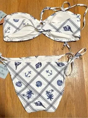 Two-piece bandeau bikini with tie straps. Navy nautical print with anchors and shells. Soft stretch fabric and removable straps. Stylish coastal design for summer wear.