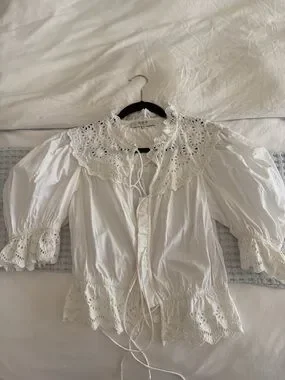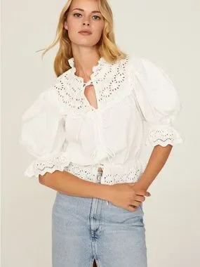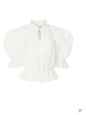 White eyelet blouse with scalloped collar and tie-front closures. Puff sleeves and eyelet trim add feminine detail. Cropped hem with elasticized waist for a gentle shape. Lightweight cotton look ideal for casual styling.