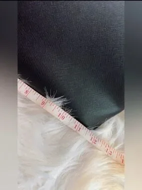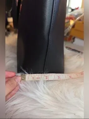 Sleek black saffiano leather tote. Gold-tone logo and matching hang tag. Structured silhouette with top handles. Polished and versatile for daily use.