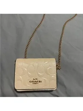Compact Coach crossbody in cream patent leather. Features embossed signature 'C' pattern. Gold-tone chain strap adds shine. Flap closure with Coach logo plaque. Sleek, versatile design for day or night.