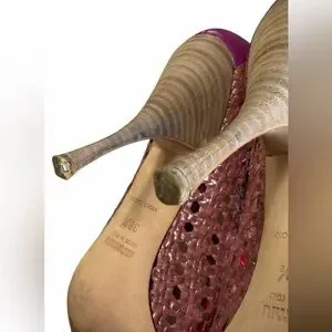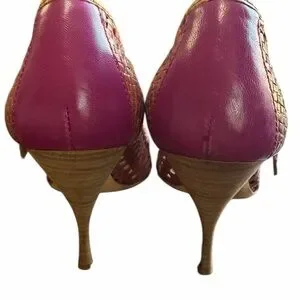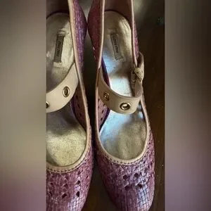 Miu Miu woven leather Mary Jane pumps. •feature a distinct basket-weave or cutout pattern in pinkish-purple leather
