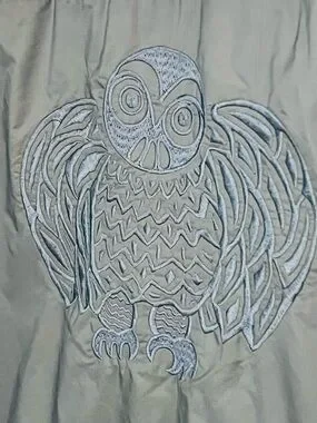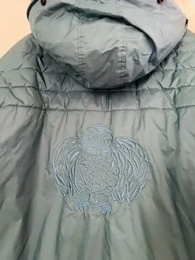 The jacket shows visible signs of normal use, but has no holes, tears, or rips. A subtle embroidered owl detail on the back adds a unique touch.