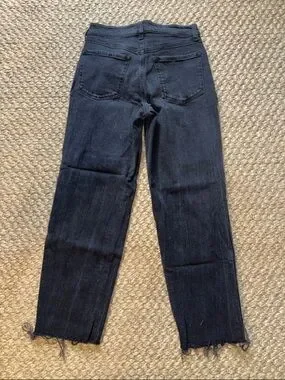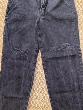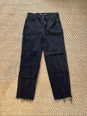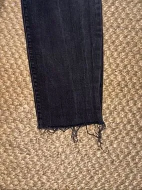 Classic black distressed jeans with knee rips and raw hem. Comfortable slim fit with five-pocket styling. Versatile black denim for casual daily wear. 29 inch inseam.