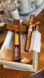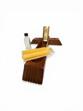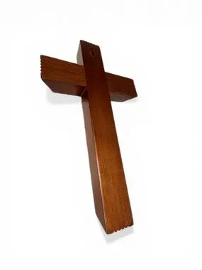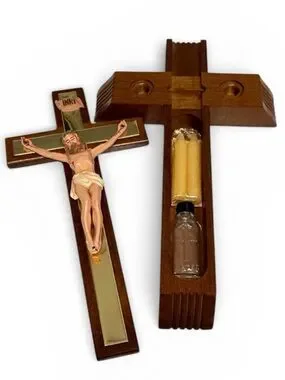 It has a slot in the back for hanging on the wall when not in use. When the Priest arrives to give the Sacrament to the sick person, it can be laid on a table and the cross slides off and gets mounted upright on the base (which has two holes to set candles in). There is a secret compartment that is revealed when you slide the crucifix off that is for storing the candles and Holy Water.