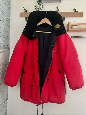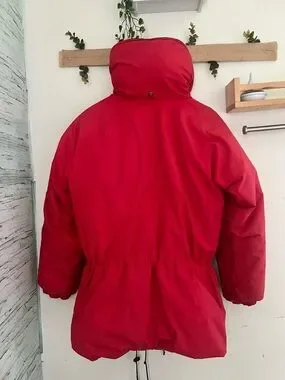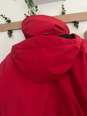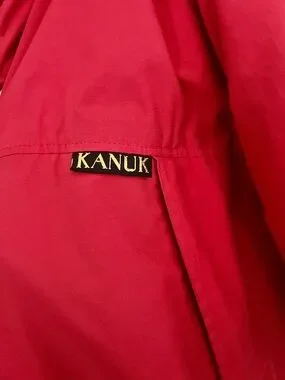 Stylish and warm KANUK winter coat in a vibrant red color, size 2. Designed for cold weather, offering both comfort and protection during winter. Unisex design, suitable for both men and women. Features an adjustable drawstring at the waist, allowing a customizable fit—can be tightened or loosened depending on your preference.