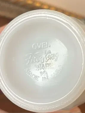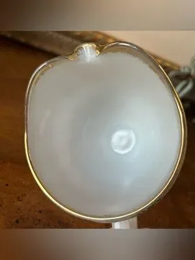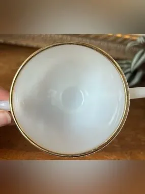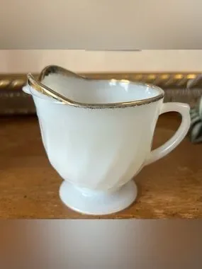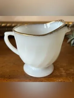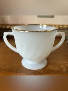 This classic milk glass set features a distinctive ribbed swirl design on a footed base, accented by a 22-karat gold trim along the rims. Often referred to as the "Golden Anniversary" or simply the "Anniversary Swirl" pattern, these pieces were popular in the 1950s and 1960s and remain highly collectible mid-century modern tableware