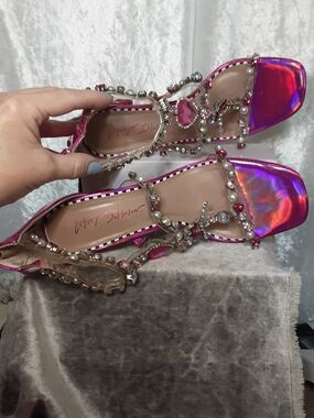 These dress shoes are absolutely beautiful, They are hot pink hologram with Dirrerent colored rhinestones and red glitter 3.25" heel.these have no missing stones and no call outs that I can see.They were only worn once to prom. These are soooo pretty.Perfect for any dressy occassion. Comes from a smoke-free pet friendly home.