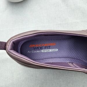 Slip-on Skechers flats with sparkling rhinestone upper and satin sufes. Cushioned insole with Ait Cooled Memory Foam for supportive and lightweight comfort. Easy pull-tab at heel for quick on and off. Subtle mauve lavender tone that pairs well with casual outfits. Size 10 wide fit.