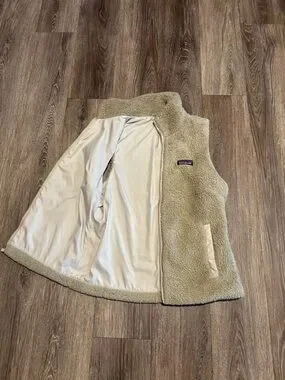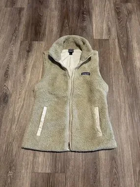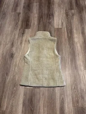 Plush sherpa fleece vest with full front zipper. Two front hand pockets with trim. Stand collar for extra warmth. Small Patagonia logo on chest.