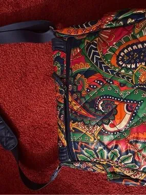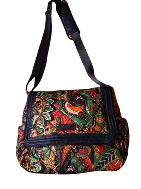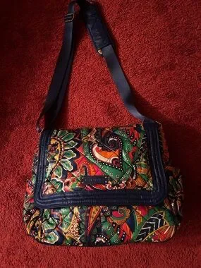 Vera Bradley crossbody with bold paisley print. Multicolor palette featuring green, red, orange and navy accents. Flap front with navy trim and adjustable strap. Pockets on the front and on the side and on the inside -big zippered pocket on the back- large bag - 15x 12 -casual , colorful everyday carry.Great for travel too!