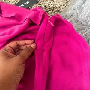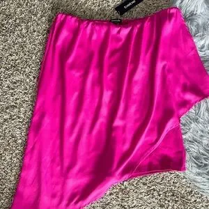 This Bebe skirt is a statement piece with its vibrant hot pink color and asymmetrical design. It comes with shorts underneath. The brand is known for its quality and style, making this a must-have item for any fashion-forward individual. The skirt is perfect for those who love to stand out and make a statement with their fashion choices.