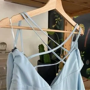 Gorgeous women’s Revolve Superdown Baby Blue Deep V-Neck Sammie Mini Skater Dress. Fully lined - hidden back zip - double cross cross straps