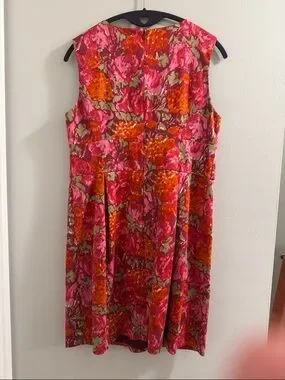 Vibrant retro sleeveless shift dress with a bold pink and orange floral print. Structured waist with decorative buttons for a flattering silhouette. Lightweight and polished for daytime or evening wear. Pink and orange tones add a lively, feminine touch.
