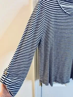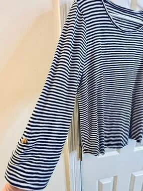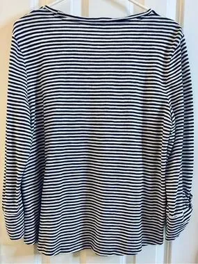 Chico's Top Knit Navy White Silver Stripe roll-tab 3/4 Sleeve Scoop casual large