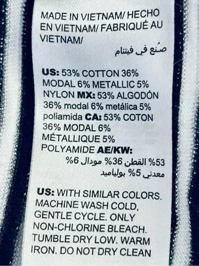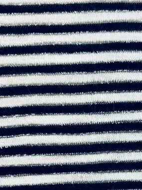 Chico's 2 The Ultimate Tee Top Knit Navy White Silver Stripe roll-tab 3/4 Sleeve Scoop casual large 53% cotton, 36% modal, 6% metallic, 3% nylon. PTP 21-22โ, length 23.5 side-24 front-25โ back. Lightweight knit with classic horizontal stripes. Boatneck neckline for a clean, casual look. Three-quarter sleeves with button roll-tab detail. Easy to pair with jeans or skirts.