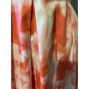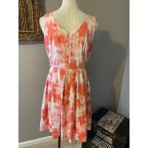 This lovely dress is by Calvin Klein in a misses size 8. Unlined, made of 98% cotton and 2% spandex. Pretty peachy pink with off white cream print. It has a V neckline and hidden zipper up the back. There is no belt included but it has string tie loops at the side.Unstretched, measured from seam to seam across the front: