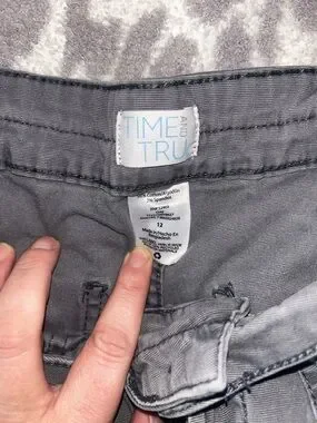 Casual women’s cargo pants in solid gray. Features front slash pockets and a buttoned cargo pocket. Mid-rise waist with belt loops and twin-button closure. Durable fabric for everyday wear.