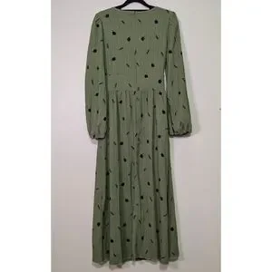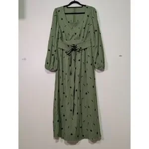 Soft sage green maxi dress with a delicate botanical print and flattering corset-style waist detail. This piece has a subtle romantic cottagecore feel with a more muted, minimalist aesthetic—perfect for everyday wear, casual events, or transitional seasons.